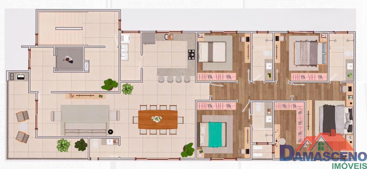 4 quartos sendo 2 suítes (1 máster com closet), sala ampla para 2 ambientes com varanda gourmet e lavabo de apoio, cozinha em conceito aberto, banheiro social, área de serviço e 2 vagas de garagem livres.