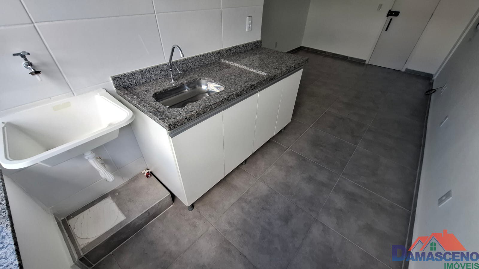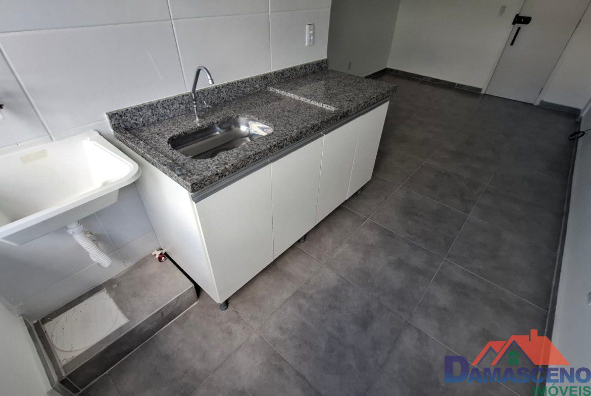 19,61 m² de área construída distribuídos em quarto/cozinha com móveis planejados, banheiro e tanque de apoio.