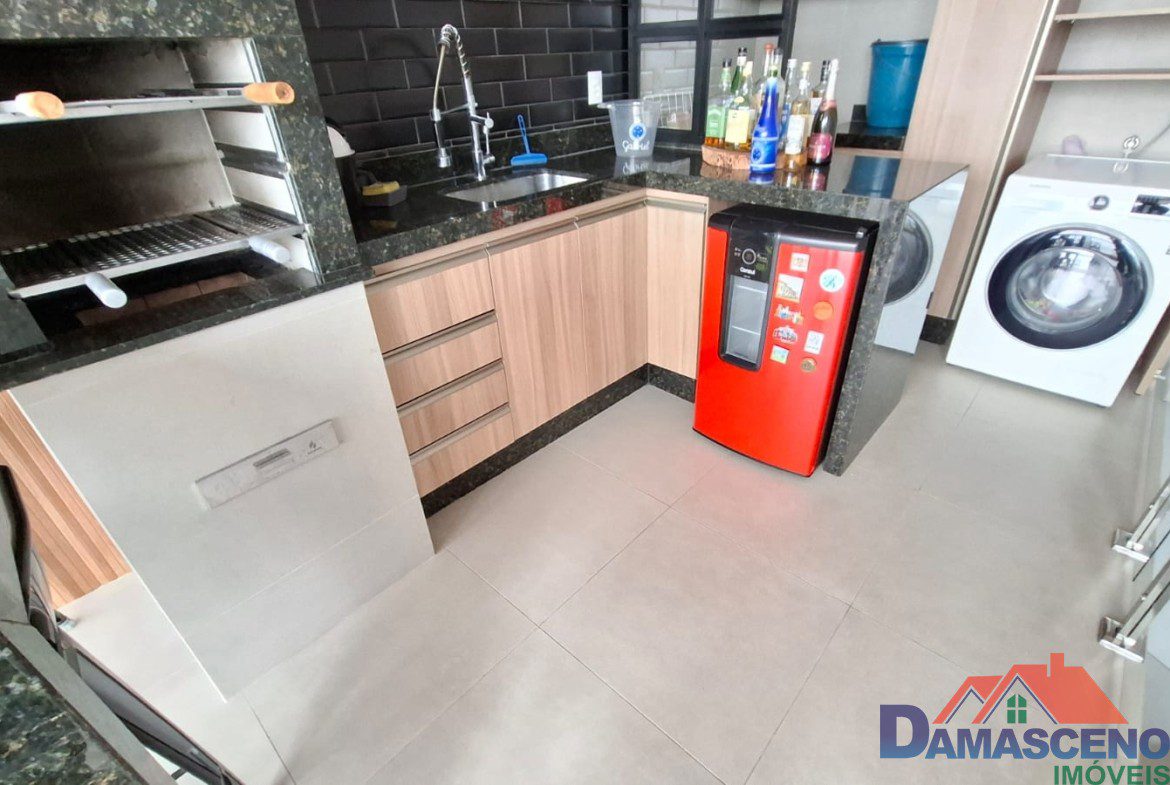 3 quartos (sendo 1 deles suíte com varanda e 2 com móveis planejados), sala para 2 ambientes, cozinha (com cooktop, forno e coifa), banheiro social, área de serviço, área gourmet e 1 vaga de garagem.