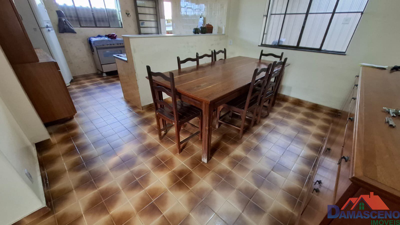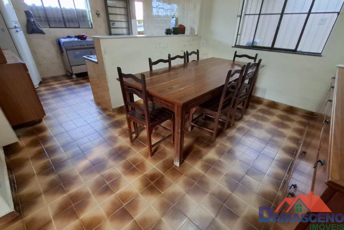3 quartos, sala de estar, copa, cozinha interna e externa, banheiro social, área de serviço, despensa e 4 vagas de garagem.