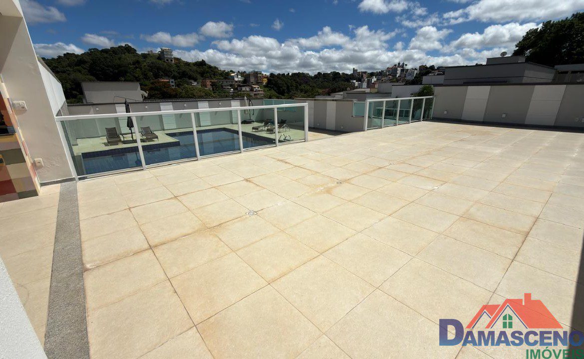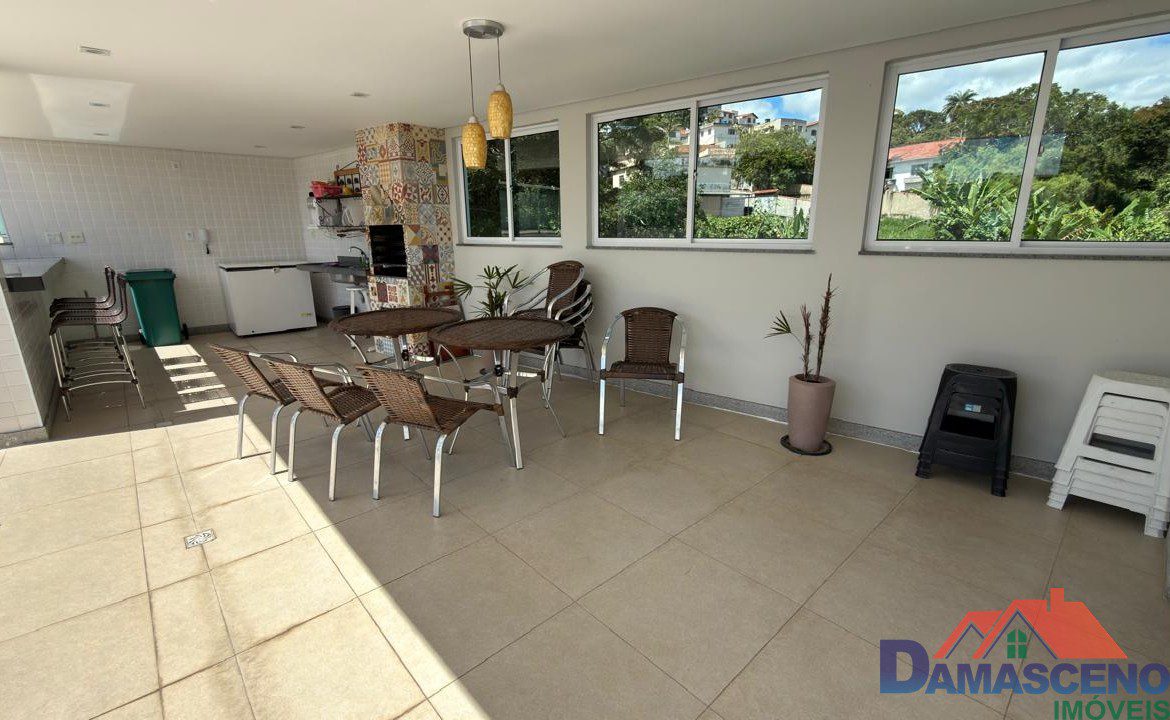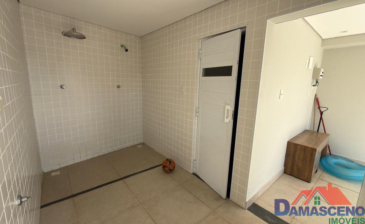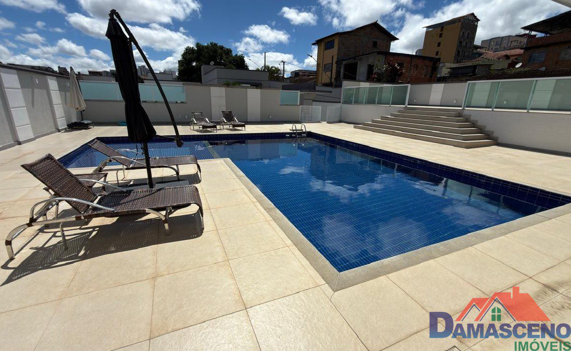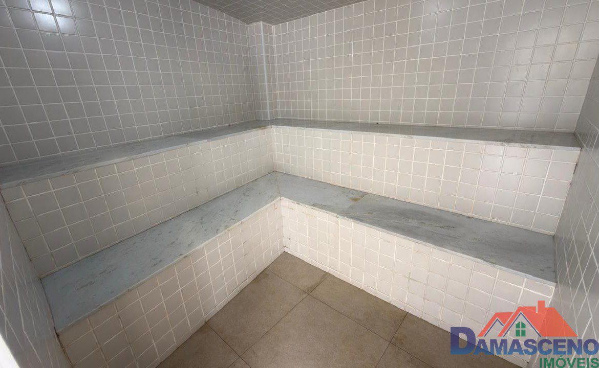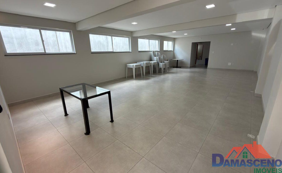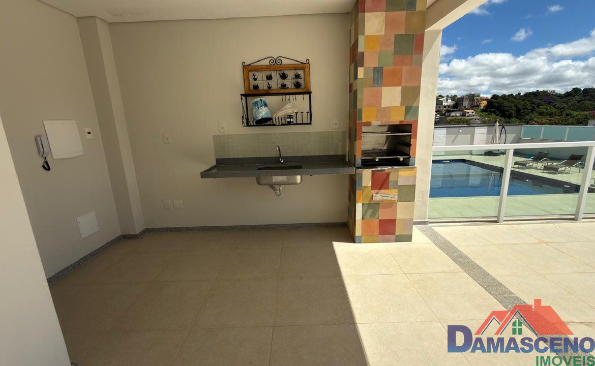 Condomínio com área de lazer completa com piscina, áreas de churrasqueira, sauna, salão de festas e porteiro dia.